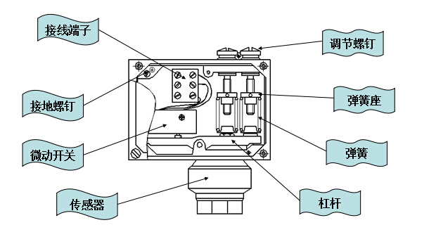壓力開關(guān)的工作原理:當(dāng)使用設(shè)備內(nèi)壓力高于或低于壓力開關(guān)的額定壓力值時(shí),開關(guān)內(nèi)部的傳感器內(nèi)碟片或其他傳感元件瞬時(shí)發(fā)生移動(dòng),通過(guò)連接的導(dǎo)桿推動(dòng)開關(guān)接頭接通或斷開,當(dāng)使用設(shè)備內(nèi)壓力降至恢復(fù)值時(shí),開關(guān)碟片瞬時(shí)復(fù)位,壓力開關(guān)自動(dòng)復(fù)位,簡(jiǎn)單的說(shuō)就是當(dāng)設(shè)備的壓力超過(guò)開關(guān)的額定值時(shí),開關(guān)內(nèi)部彈性元件的自由端產(chǎn)生位移,直接或間接的推動(dòng)開關(guān)元件,從而改變開關(guān)元件的通斷的狀態(tài),已達(dá)到控制設(shè)備壓力的目的。